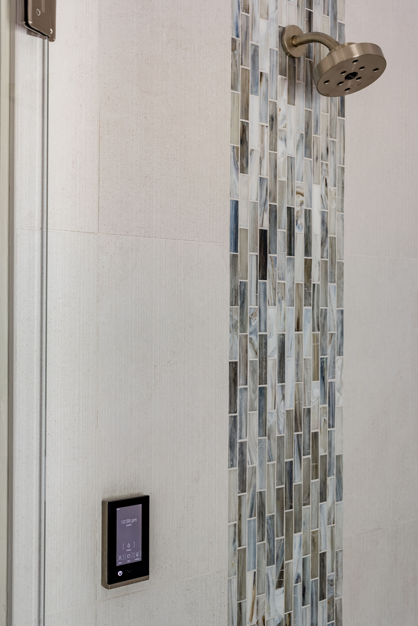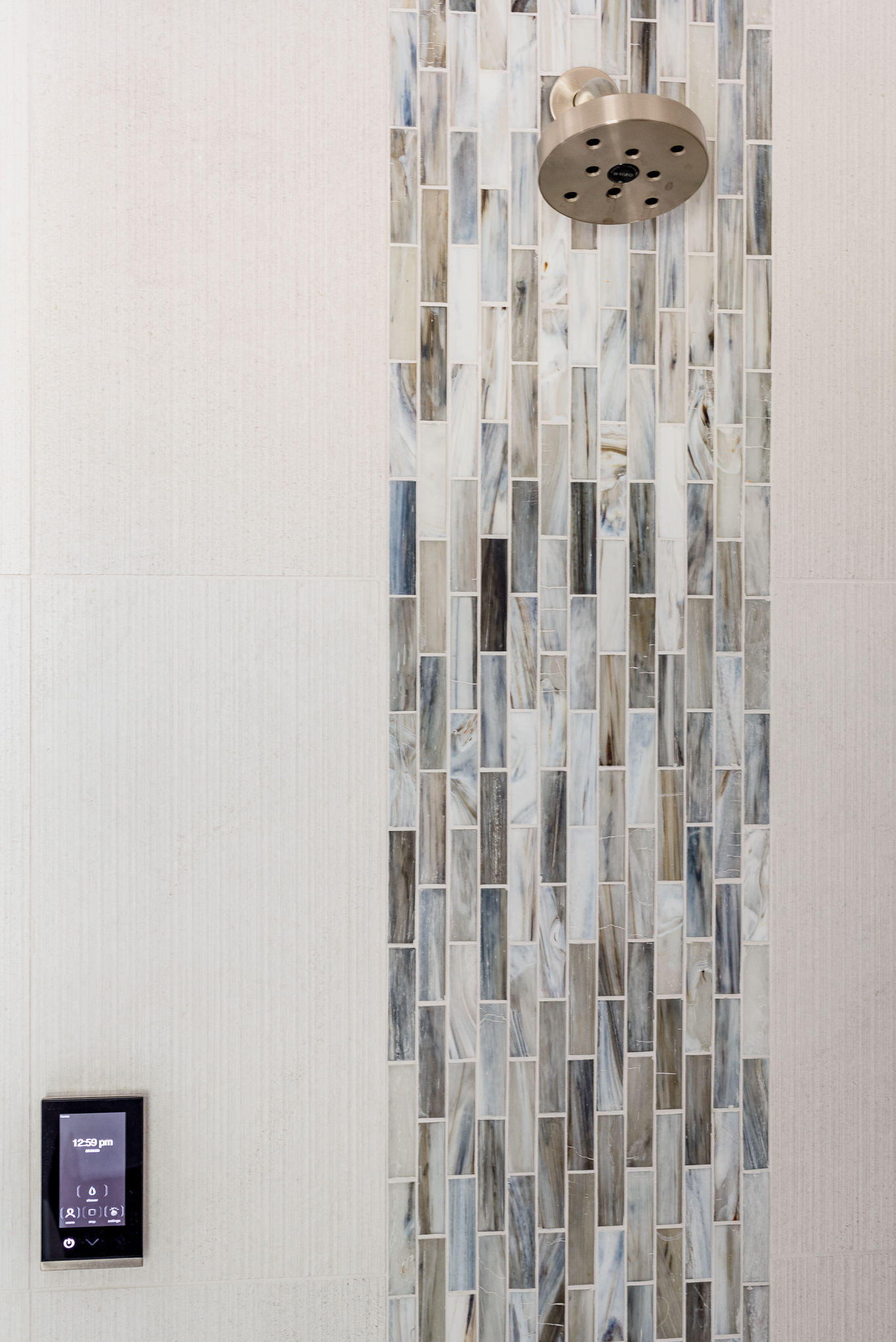 The new layout includes a spacious zero-threshold walk-in shower with a custom corner bench, linear drain, and multiple showerheads, including a ceiling-mounted rainfall fixture. A vertical mosaic tile inlay and digital shower controls blend function and style, while integrated niches add practical storage.