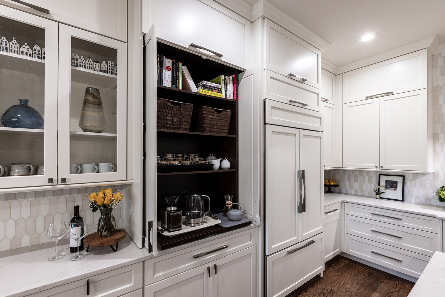 A previously unused wall became home to a custom wine bar, complete with a 28″ wine fridge, glass-front upper cabinets, and a full-height backsplash that ties it into the kitchen design. This addition added both functionality and a touch of personality to the room.