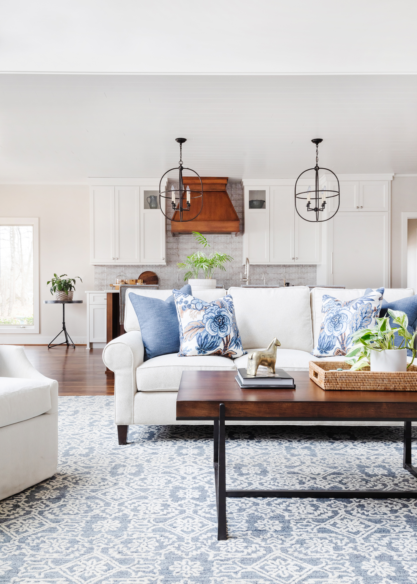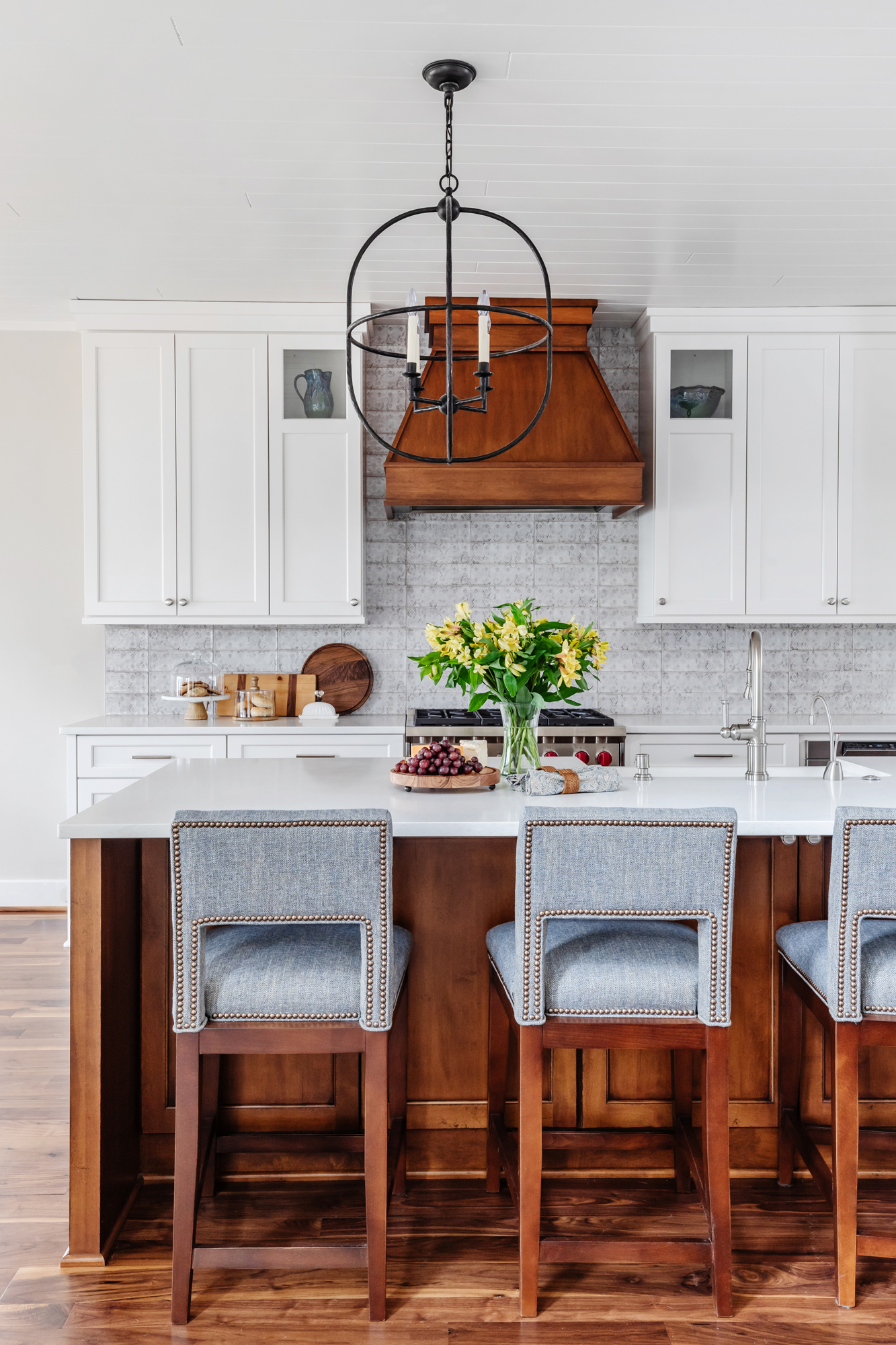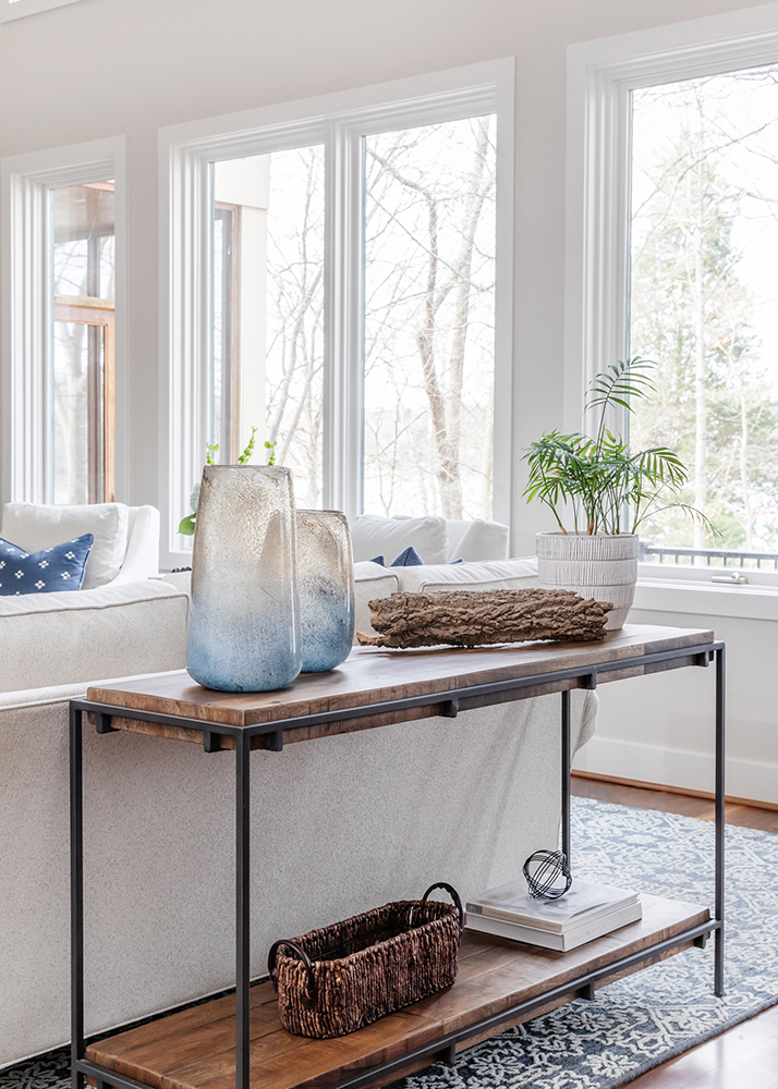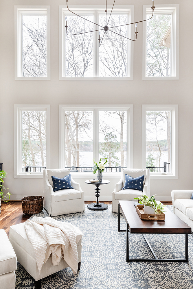 To improve the overall flow and maximize natural light, we opened up the wall between the kitchen and living room—creating a bright, open-concept layout ideal for both daily living and entertaining. The new kitchen features custom white cabinetry, a warm wood range hood, and a large central island designed for gathering. Wide sightlines now lead straight to the lake, and the living room is fully integrated with updated built-ins, cozy furnishings, and expansive windows that showcase the view.