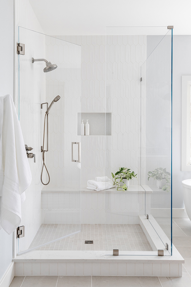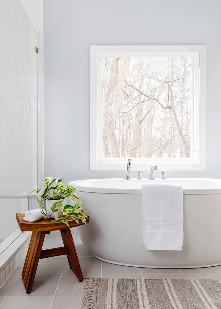 In the primary bath, we removed the outdated tub and closed-in shower, replacing them with a spacious glass-enclosed shower and a freestanding soaking tub. Soft, modern finishes add warmth and elegance, while natural light filters through to highlight the wooded surroundings.