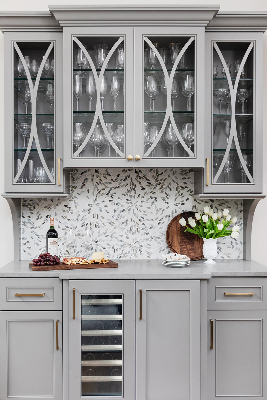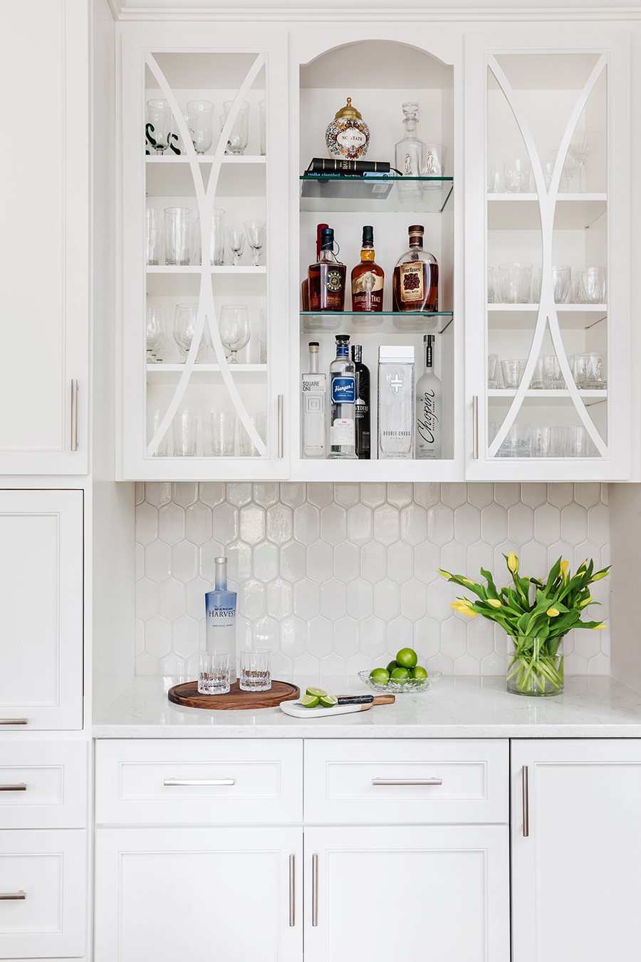 The project also includes a newly designed coffee bar, a dedicated dry bar, and refinished hardwood floors throughout for a seamless, refreshed look. Behind the scenes, we relocated plumbing to an upstairs bathroom, which required rebuilding a cabinet in the adjacent master bedroom—a great example of how even small changes can make a big impact when thoughtfully managed.